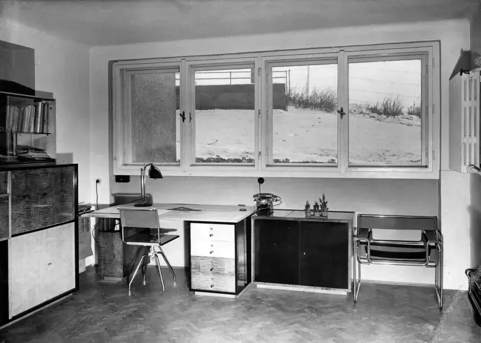 这座由莫尔纳设计的三层建筑中所有的一切,看起来都与当时人们习惯的建筑大不相同:它的平屋顶、朴素的外墙,从远处一看,就格外显眼。室内摆放着包豪斯式的家具,安装了一盏不透明的吸顶灯,布劳耶设计的钢管椅——包括那把著名的瓦西利椅——还有莫尔纳定制的书桌和橱柜。通过利用内置的橱柜、多功能的家具和巨大的窗户,莫尔纳让这个狭小的地方获得了超乎想象的空间和光线。